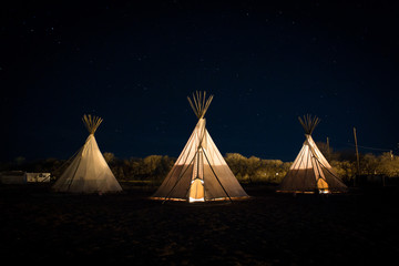 Experience magical nights under the Milky Way with cozy tipis and a vibrant campfire, a truly enchanting wilderness adventure.