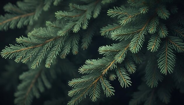 Frosted fir twig stretching across winter forest with golden bokeh and floating particles