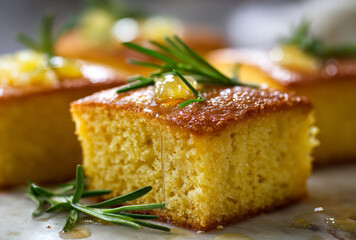 A moist, golden yellow lemon and rosemary cornbread cake garnished with fresh rosemary sprigs