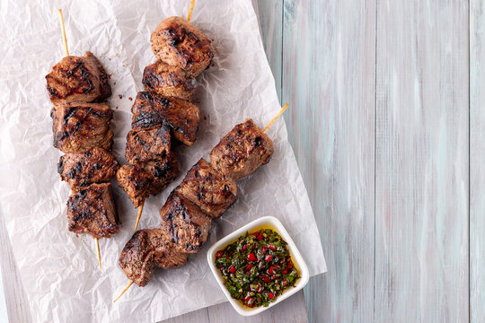 Grilled beef meat skewers with chimichurri sauce, horizontal, top view, copy space