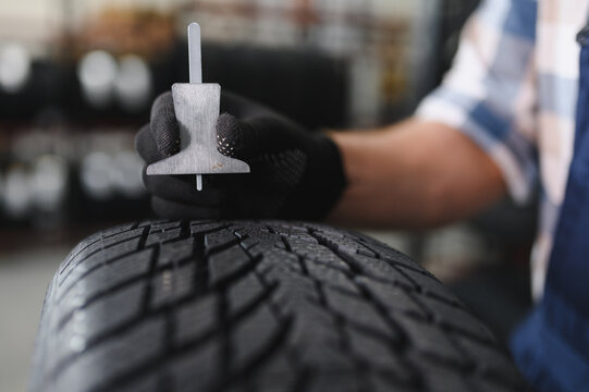 worker tire fitting in the car service, auto mechanic checks the tire and rubber tread for safety, concept: repair of machines, fault diagnosis, repair. man buy in car service shop