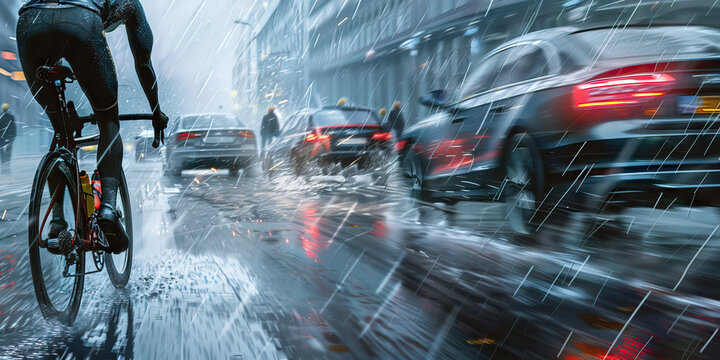 A cyclist slams on the brakes, tires squealing as they skid across the wet pavement, narrowly avoiding a collision with an oncoming car.