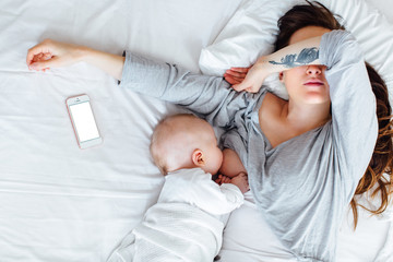 A tired mother covering her eyes as she breastfeeds her baby boy lying down on a bed. Her phone is next to her.