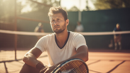 Sad and tired man tennis player sitting on the tennis court.