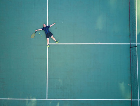 A tennis player lies exhausted on the court after a hard-fought victory.
