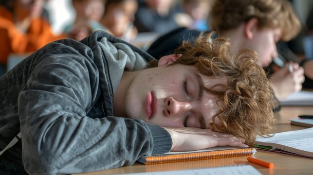 Tired teen student sleeping at desk in classroom during lesson on blurred background of classmates ..