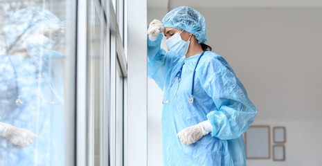 A tired surgeon stands thoughtfully at the window after a complex operation