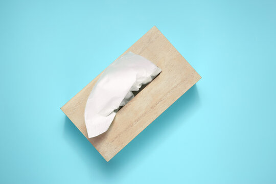 Box of paper tissues on light blue background