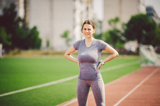 Portrait of a beautiful young caucasian woman with long hair in the tail and big breasts posing in gray sportswear standing training on a running stadium, a red rubber track in summer on a sunny day