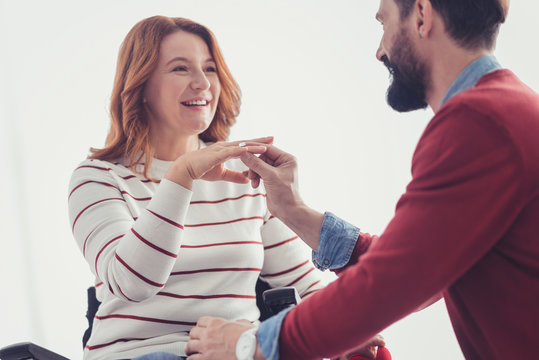 Important step. Cheerful young man asking his beautiful girlfriend to marry him and looking at her while giving the ring