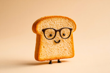 Adorable slice of toast with glasses, a smiley face, and tiny legs creating a fun, whimsical character