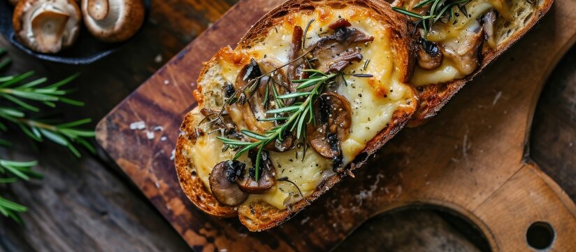 Top view of a toasted cheese and mushroom sandwich on sourdough bread with rosemary, served on a wooden board.