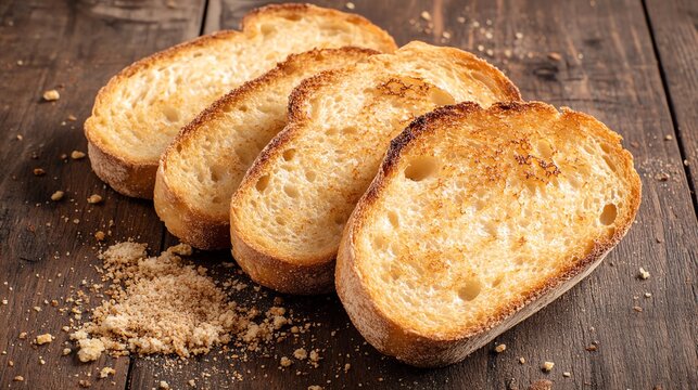 Close up of a single slice of golden brown toast on a white background showing texture and browning marks