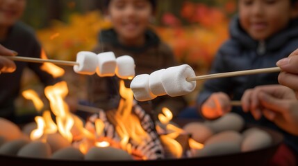 Family gathering, toasting marshmallows by a cozy fire pit, vibrant autumn leaves surround them, joyful moments of togetherness, ample space for promotional messaging.
