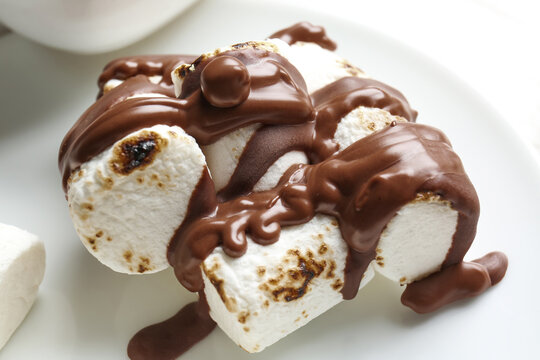 Plate of tasty grilled marshmallows in chocolate, closeup