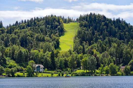 Scenic view of Lake Bled with beautiful reflections and mountain with chair lift and tobogganing in the background on a blue cloudy summer day. Photo taken August 8th, 2023, Bled, Slovenia.