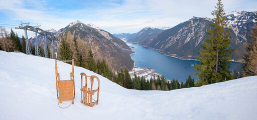 two wooden sledges at the mountain station Zwolferkopf, tobogganing in Pertisau, Tyrol with a view of Lake Achensee