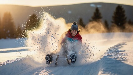 Happy young person sledding down snowy hill at high speed. Exhilarating winter fun and outdoor action during golden hour sunset