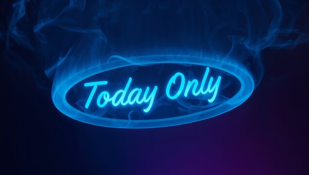 Glowing cyan neon sign reading Today Only in oval ring, bathing studio with halo and smoke