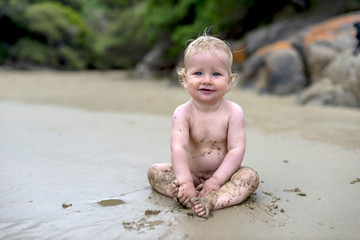 Mother playing with toddler at sunset beach