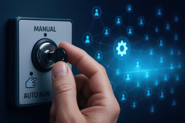 Manual key turn automation ai agent workflow control panel networks gear icon blue glow