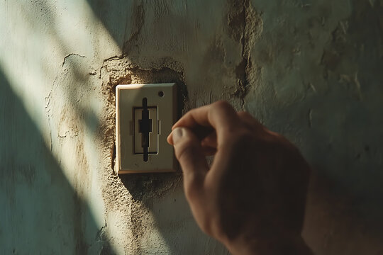 Vintage light switch toggling on wall, ivory electric button controlling power supply, providing home hardware