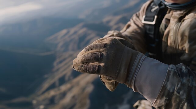 A close-up of gloved fingers adjusting brake toggles mid-flight, subtle micro-movements shaping the paraglider’s trajectory over rolling valleys — fine control and masterful airborne navigation.