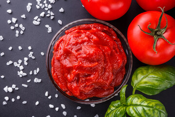 Freshly prepared tomato sauce in glass bowls with ripe tomatoes and basil leaves