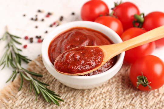 Napkin with bowl and spoon of tasty tomato paste on white grunge background