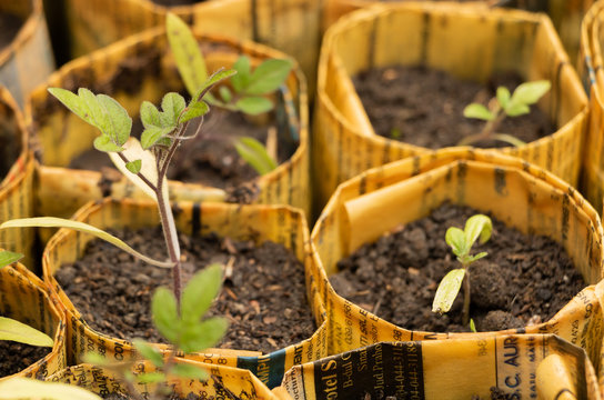 Young tomato seedling sprouts in the peat pots. Gardening concept.
