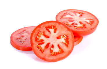 Slices of fresh ripe tomato arranged on a white background, showcasing the vibrant red color and intricate seed pattern isolated on white background