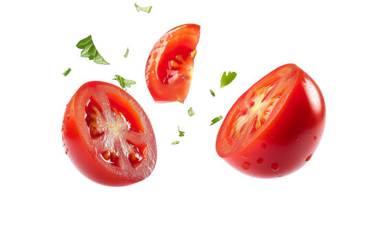 Tomato with half slices falling or floating in the air with green leaves isolated on background, Fresh organic fruit with high vitamins and minerals.
