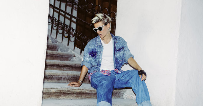 strong, laid back, cool girl, tomboy in black and white street style scene. Outdoor fashion images of beautiful tomboy. Hip blogger girl lgbt