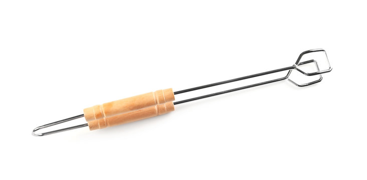 New barbecue tongs with wooden handle on white background