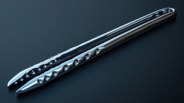 Stainless steel tongs holding a clear ice cube on a reflective surface with water droplets