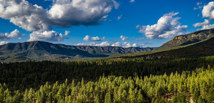 Aerial view of the Tonto National Forest from above the Pine Trailhead in Arizona with blue sky,  white clouds and green ponderosa pines