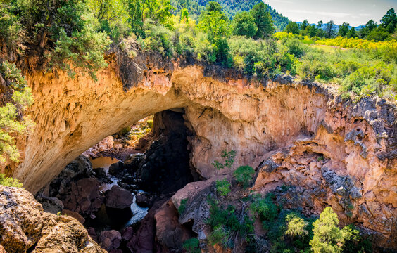 People stand near the river running through Tonto Natural Bridge in Payson Arizona