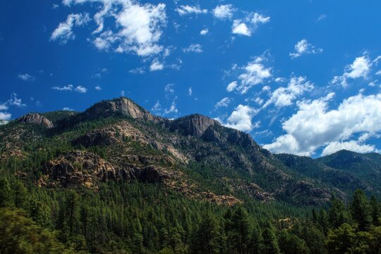 Serene Payson AZ Landscape: Majestic Mountains Under a Blue Sky Surrounded by Lush Forests and Gentle Clouds