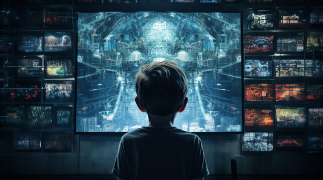 Back view of a boy child head in front of a huge tv screen representing too much children screen time
