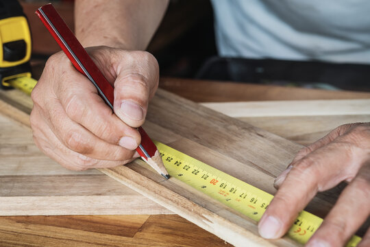 Carpenter using a measuring tape and mark a cut line with pencil on a wood board.DIY maker and woodworking concept. selective focus