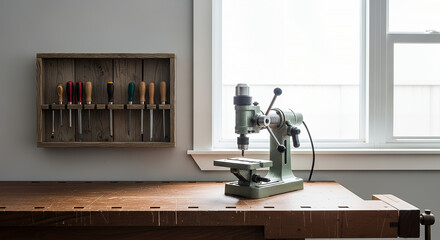 Well-equipped workshop with a drill press and tool racks beside a bright window