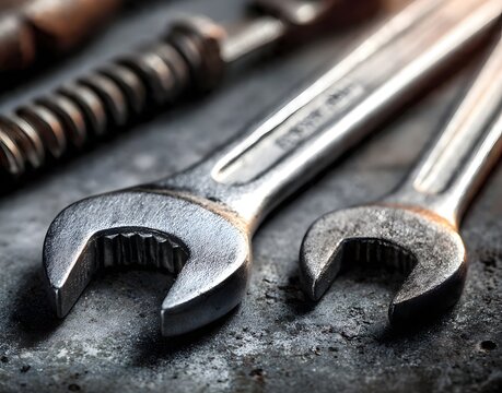 A close-up of two shiny metal wrenches lying on a dark gritty industrial surface, symbolizing mechanical repair, tools, engineering, and professional maintenance.