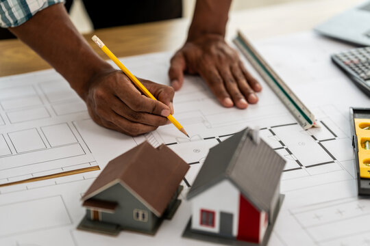 Architecture students diligently study the detail in blueprints and make house model building samples with architecture tools at night in their alone room.