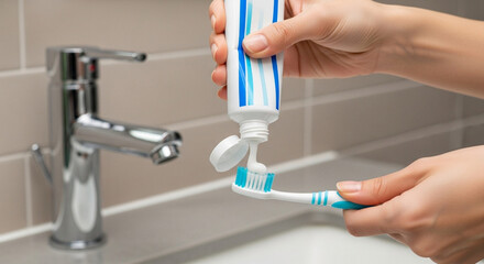 Morning routine: applying toothpaste to toothbrush in comfortable bathroom