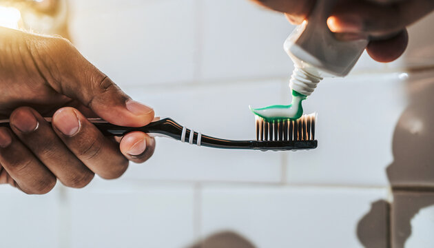 Close-up of a hand squeezing toothpaste onto a toothbrush in a bathroom setting