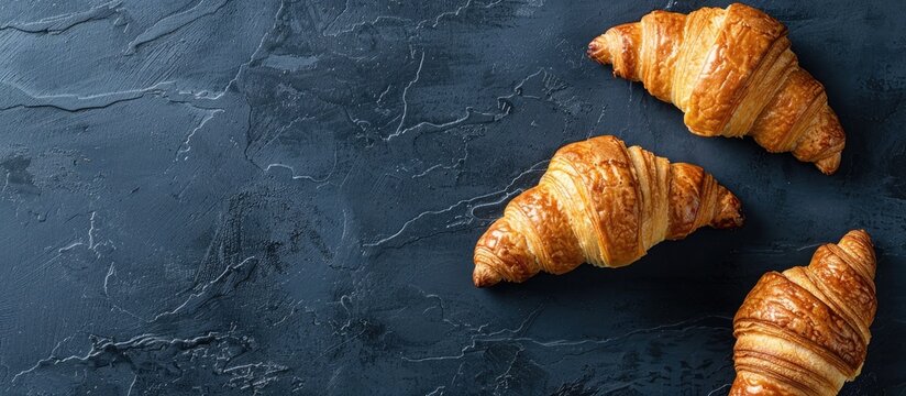 Vintage dark background displaying fresh traditional French croissants from an overhead perspective with blank space for imagery. Copy space image. Place for adding text and design