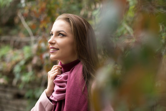 Portrait of young woman in pink topcoat at autumn day