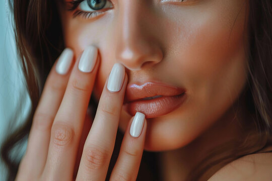 Portrait of a woman with clean healthy skin and a long manicure with milk nail Polish close-up.