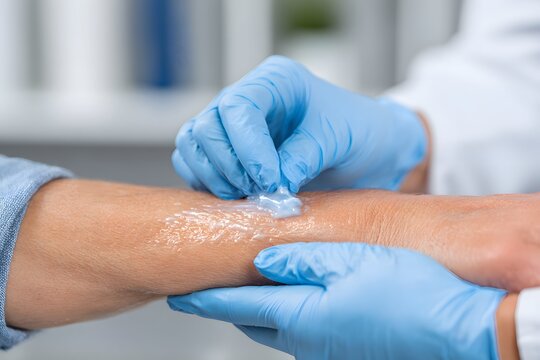 Analgesia nurse spreads soothing cream like a gentle breeze on a patient’s forearm.