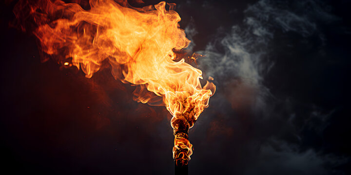 Gas torch is burning with strong orange natural gas flame with smoke on oil refinery plant on black sky background